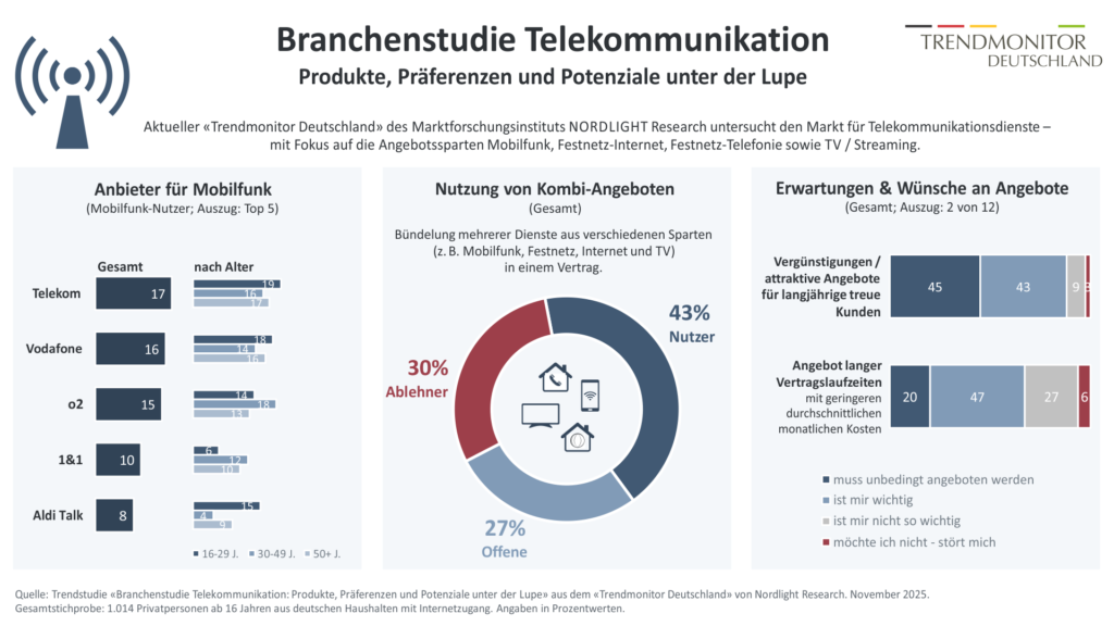 Dies sind Ergebnisse der aktuellen Branchenstudie «Telekommunikation in Privathaushalten: Markt & Möglichkeiten», die im Rahmen des „Trendmonitor Deutschland“ vom Marktforschungsinstitut Nordlight Research durchgeführt wurde. 1.000 Verbraucherinnen und Verbraucher ab 16 Jahren aus deutschen Haushalten mit Internetzugang wurden ausführlich zur Nutzung von Telekommunikationsdiensten, zur Kundenzufriedenheit und zu Produkt- und Anbieterpräferenzen in den Angebotssparten Mobilfunk, Festnetz-Telefonie, Festnetz-Internet und TV / Streaming befragt.